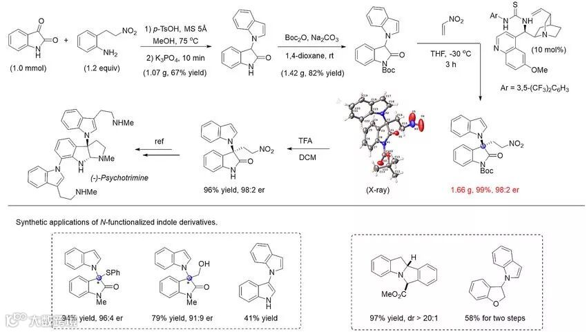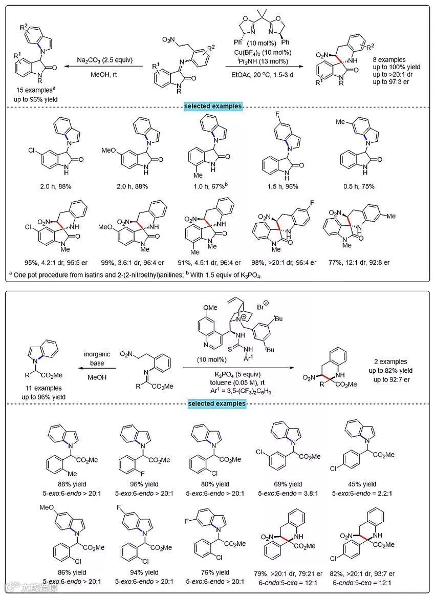 利用该方法,可从靛红和2-(2-硝基乙基)苯胺出发,通过一锅法串联反应方便合成系列3-吲哚基取代的氧化吲哚,或高产率和立体选择性得到螺四氢喹啉化合物。α-酮酸酯衍生的亚胺同样能区域选择性生成吲哚衍生物,或在手性相转移催化条件下发生C-亲核加成生成手性四氢喹啉化合物。