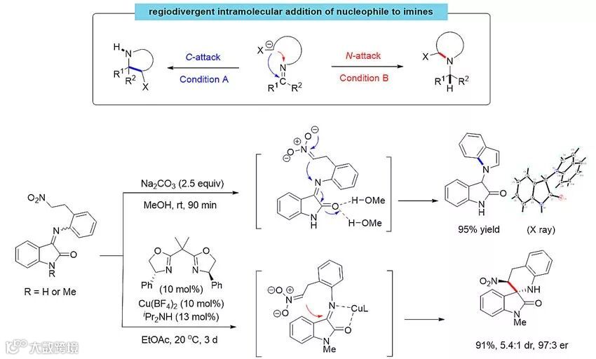 近日,华东师范大学周剑教授团队发展了通过调控亚胺分子内亲核加成反应的区域选择性来多样性构建含氮杂环的方法。对亚胺的亲核加成往往发生在带部分正电荷的C端,要实现对N端的亲核加成,则需亚胺碳上具有拉电子取代基来稳定过渡态中产生的负电荷。对亚胺N端的分子间亲核加成反应已有一定进展,但主要利用格式试剂等金属试剂与非环状活泼亚胺反应来制备氨基酸衍生物等,尚未用于含氮杂环化合物的合成。作者认为,若能发展分子内的对亚胺C端或N端的区域选择性亲核加成反应,将为含氮杂环的多样性构建提供一个新策略,因为改变亚胺结构、亲核试剂种类和链接基团均将导向不同的含氮杂环化合物。他们首先尝试在亚胺氮上链接硝基烷烃作为亲核试剂来研究这一设想。经条件优化,发现从靛红和2-(2-硝基乙基)苯胺衍生的亚胺出发,在无机碱/甲醇体系下,主要发生对亚胺N端的亲核加成反应,以95%的产率得到吲哚化合物;而使用手性铜催化剂,则专一地发生对C端的加成,以高产率和er值得到手性氧化吲哚螺四氢喹啉化合物。