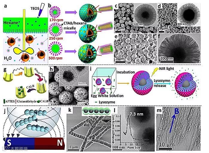 Figure 2. Schematic diagrams showing (a) the synthesis system under various stirring rates and (b) pore enlargement by n-hexane swelled micelles with the assistance of mechanical stirring; SEM images of CS-MMSs obtained at a stirring rate of (c) 170 rpm; (d) 250 rpm and (e, f) 500 rpm; The insets are the corresponding TEM images. (g) Schematic diagram showing the surface modification of pore wall for immobilization of enzyme (CALB) in mesopores; (h) SEM and TEM (the inset) images of CS-MMSs used for enzyme immobilization. (i) Schematic diagrams of separating lysozyme from egg white solution and the controlled release under NIR irradiation using the CS-MMSs. (j) Schematic diagram showing the assembly of magnetic particles during the synthesis under a magnetic field; (k) SEM, (l) TEM images, and (inset in l) pore size distribution of Fe3O4@SiO2@mSiO2 nanochains; (m) SEM image showing the orientated arrangement of nanochains in an applied magnetic field. (Modified with permissions from American Chemical Society, Elsevier, and Wiley).