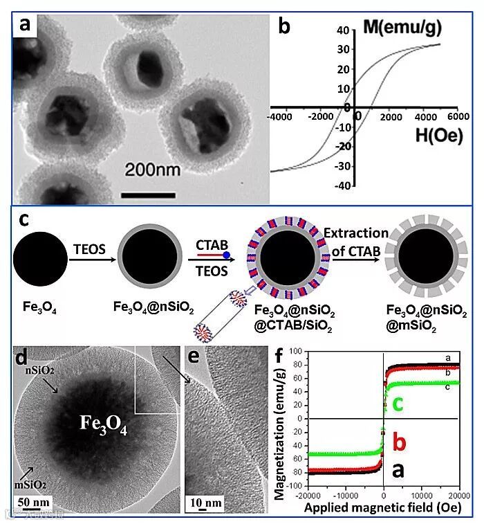 Figure 1. (a) TEM image and (b) the magnetic hysteresis loop of Fe3O4@nSiO2@mSiO2 obtained using C18TMS as both template and silica precursor. (c) The formation procedure and (d, e) TEM images of Fe3O4@nSiO2@mSiO2 Microspheres using CTAB as a template; (f) The magnetic hysteresis loops of (black) Fe3O4 particles, (red) Fe3O4@nSiO2, and (green) Fe3O4@nSiO2@mSiO2 microspheres. (Modified with permissions from American Chemical Society and Royal Society of Chemistry).