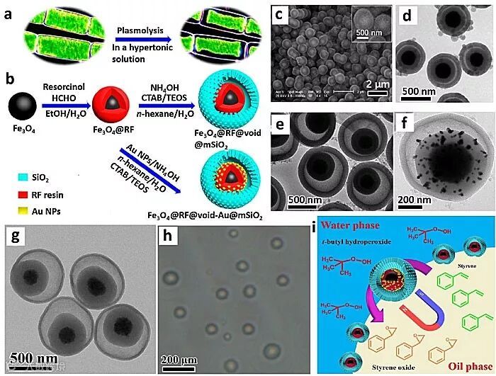 Figure 6. (a) Schematic diagram for plasmolysis process of plant cell; (b) Synthesis procedure for the YS-MMS microsphere. (c) SEM and (d, e) TEM images of YS-MMS with different void size; (f) TEM image of YS-MMS microspheres with Au NPs in-situ loaded into the void space. (g) TEM image of yolk-shell magnetic mesoporous organosilica spheres; (h) The optical microscopy image of the formed Pickering emulsion; (i) Microscopic scenario of the catalytic reaction occurring on the emulsion platform. (Modified with permissions from American Chemical Society and Wiley).