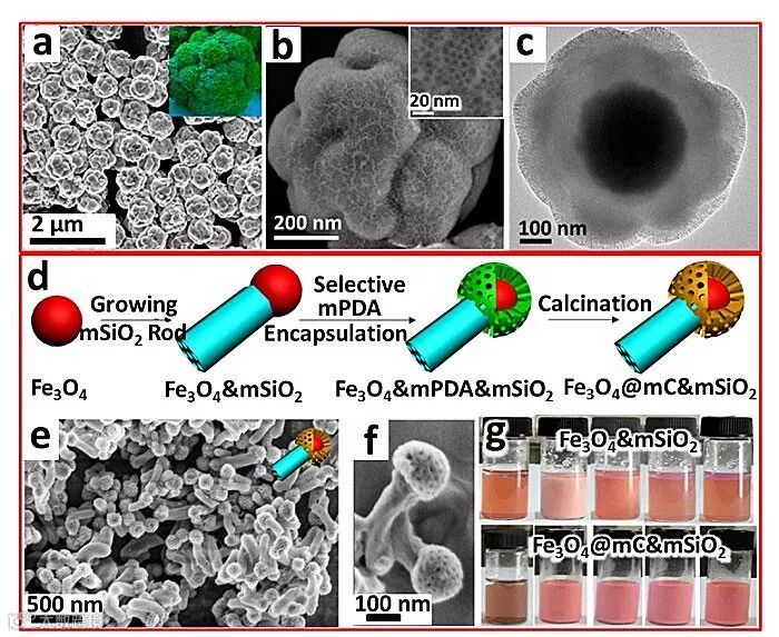 Figure 5. (a, b) SEM and (c) TEM images of rough Fe3O4@RF@mSiO2 particles. (d) Fabrication scheme (e, f) and SEM images of match-like Fe3O4@mC&mSiO2; (g) Optical photos of Pickering emulsion solution of toluene/H2O in the presence of the obtained dual-mesoporous Fe3O4@mC&mSiO2 Janus and Fe3O4&mSiO2 nanoparticles. (Modified with permissions from American Chemical Society).