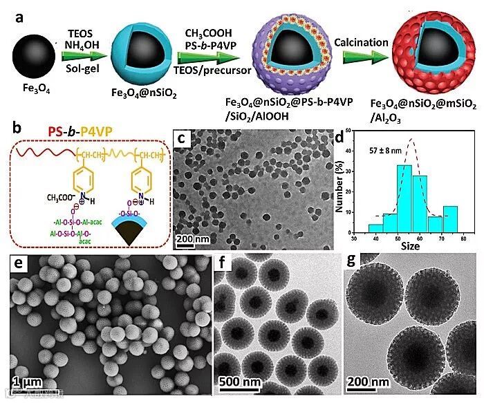 Figure 3. (a) synthesis route and interface co-assembly scheme for core-shell magnetic mesoporous aluminosilicate (Fe3O4@nSiO2@mSiO2/Al2O3) microspheres; (b) schematic diagram shows the electrostatic interaction between the surfactants and core materials; (c) TEM image and (d) size distribution of PS-b-P4VP micelles; (e) SEM and (f, g) TEM images of Fe3O4@nSiO2@mSiO2/Al2O3. (Modified with permissions from Wiley and American Chemical Society).