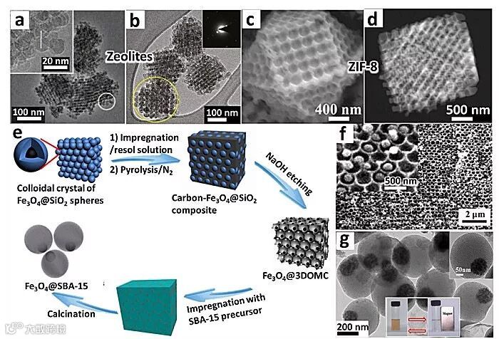 Figure 4. (a) TEM image of mesoporous zeolite produced from 3DOM carbon template. (b) TEM image of mesoporous LTA. (c) SEM and (d) STEM images of macroporous ZIF-8 produced from 3D PS monolith. (e) Fabrication scheme for Fe3O4@SBA-15 through confined synthesis; (f) SEM images of the 3-D ordered magnetic macroporous carbon (3DOMC); (g) TEM image of Fe3O4@SBA-15 spheres (inset is the optical photos of magnetic separation of products). (Modified with permissions from the Nature Publishing Group, American Chemical Society, the American Association for the Advancement of Science).