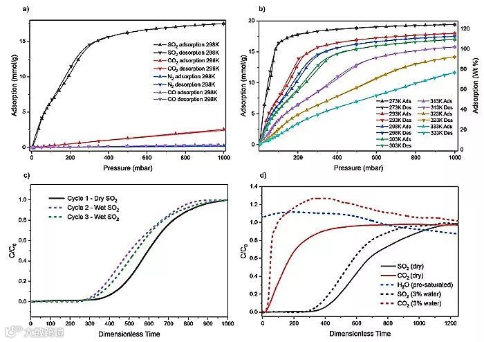 图 3. 等温吸附曲线和动态流动床实验。图片来源:Nat. Mater.