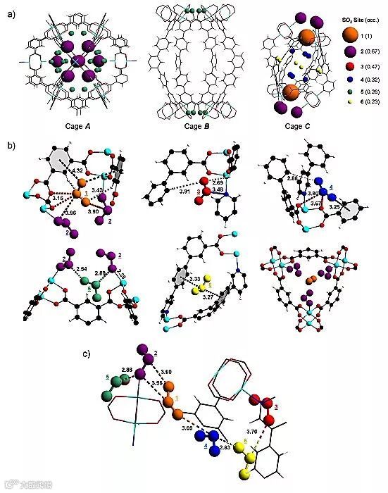 研究者通过一系列晶体学和光谱学的表征手段,包括原位同步辐射X-光衍射、非弹性中子散射,精确地展示出了MFM-170所具有的三种不同类型的孔道,以及二氧化硫在其孔道内的六个不同的作用位点。吸附的二氧化硫集中于第一种和第三种孔道中。在第三种孔道中,二氧化硫与配位不饱和的铜离子的作用占主导地位。这说明其最主要的作用位点是MFM-170中配位不饱和的铜离子。