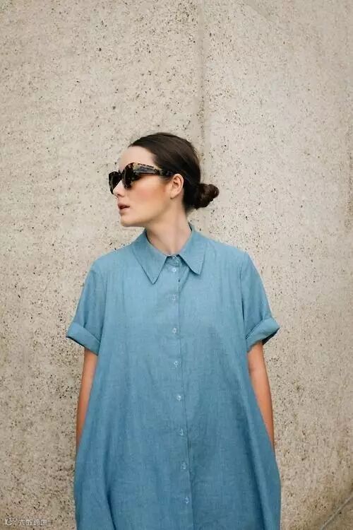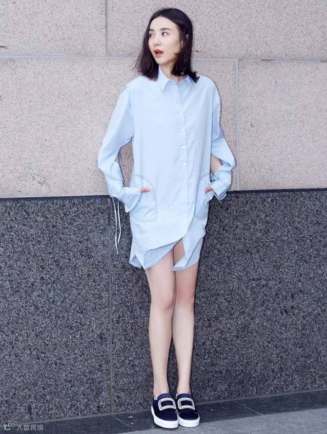 穿了蓝色oversize衬衫