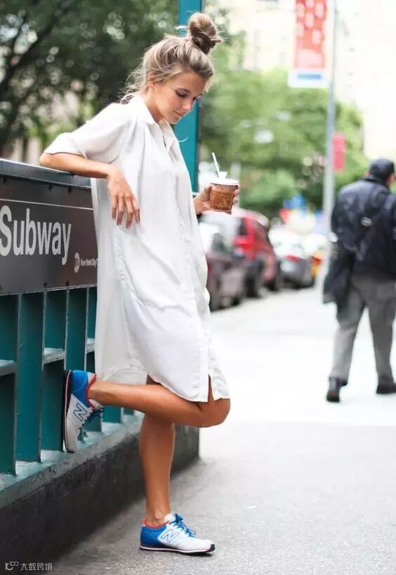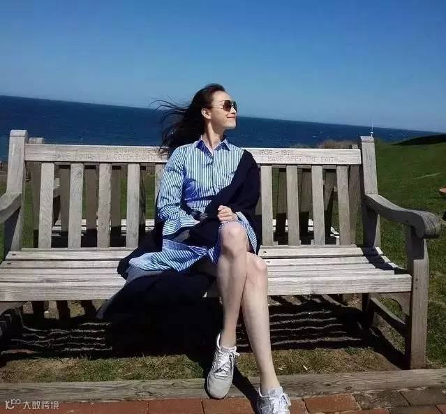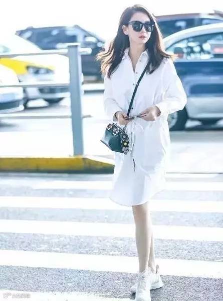 倪妮用蓝白条纹衬衫裙搭配灰色运动鞋