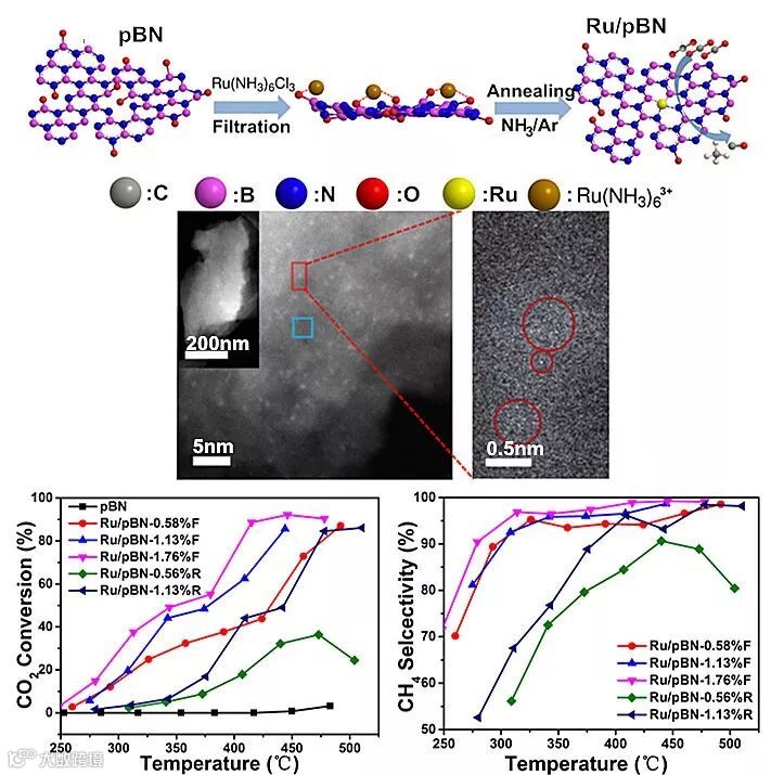 美国莱斯大学(Rice University)Pulickel M. Ajayan团队、南卡罗来纳大学(University of South Carolina)Jochen Lauterbach团队及南京理工大学孙东平教授团队合作,尝试以多孔h-BN为基底,经过一步真空抽滤过程成功制备了单原子Ru/h-BN催化剂,并用于催化CO2的甲烷化反应。所制备的Ru/h-BN催化剂具有较低的Ru含量(0.58 wt%),表现出高CH4选择性(93.5%)、催化稳定性(反应110h)、高反应速率(1.86 mmolCO2/(gcat s) at 350 °C , 1.0 MPa)。从实验结果及理论模拟可以得出,高催化活性、选择性来自于Ru的单原子分布,及与h-BN的配合度。本研究表明,h-BN是金属热催化剂良好的基底材料,为其他单原子热催化剂的研究提供了参考。