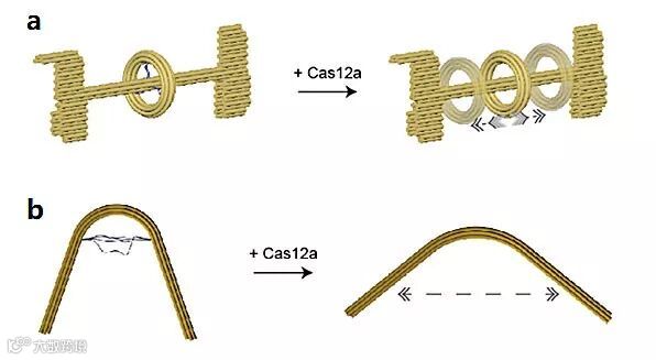 最近,耶鲁大学Chenxiang Lin团队的Qiancheng Xiong和Chun Xie等人提出了利用CRISPR-Cas12a处理DNA折纸结构,合成可控纳米结构的方法。他们首先证实了CRISPR-Cas12a能够在无差别地水解DNA单链的同时,保证DNA双链及折纸结构的完整性(图1a)。接着,用DNA折纸术构建了一个“糖葫芦”状的结构(图1b)。并以此结构为基础,加入适当的互补DNA链,选择性地将环与杆之间的连接链由单链变为双链,从而特异性地控制CRISPR-Cas12a在折纸上的作用位点,使指定的环脱离杆。为进一步扩展该方法的通用性,他们又构建了轮烷折纸结构,并证实了CRISPR-Cas12a有效释放了轮烷中的环状结构(图2a)。同时,他们将此方法扩展到了U形折纸结构,U形折纸双臂之间单链的拉扯使折纸过度弯曲,在水解掉单链后,折纸的双臂所成角度显著增大(图2b)。这一策略展现了将DNA折纸结构作为储能器件的可能性。