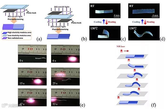 图3. (a)和(b)分别为折叠形与波浪形液晶弹性体制备示意图;(c)和(d)分别为薄膜在变温时的可逆折叠形变与波浪形变;(e)微步行器在红外光照射下的爬行;(f) 微步行器爬行示意图。
