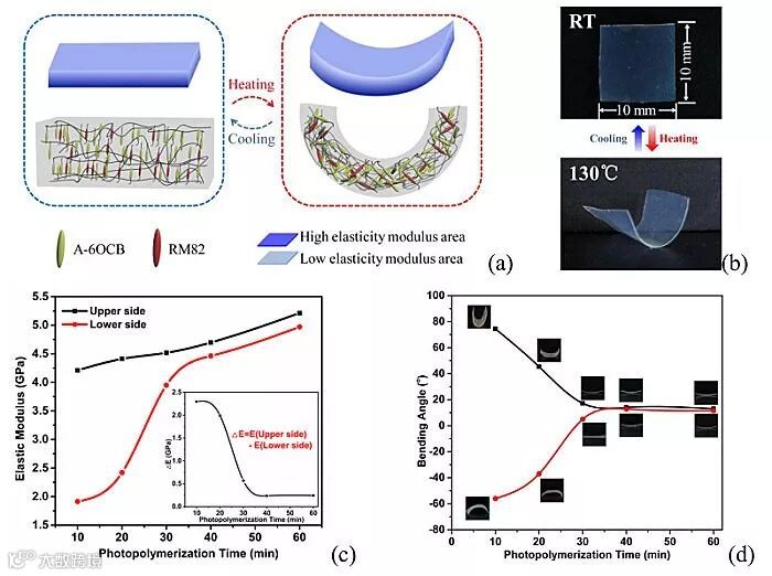 图1. (a)垂直取向液晶弹性体弯曲示意图;(b)薄膜在变温时的可逆弯曲形变;(c)薄膜两侧的弹性模量与聚合时间关系图;(d)不同聚合时间薄膜的弯曲度变化。