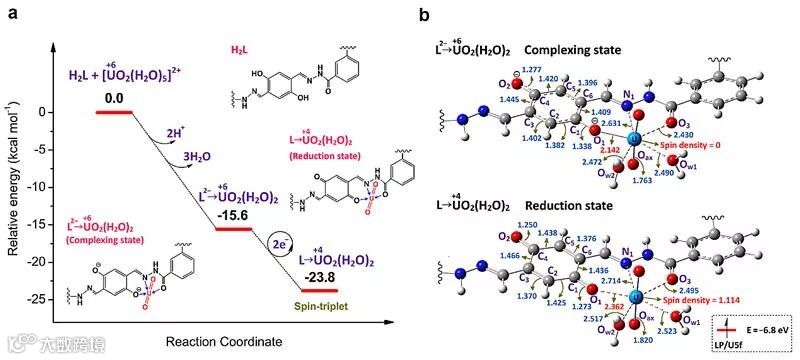 图3. (a)DFT计算中涉及到的相应物种及其相对自由能;(b)优化后的Complexing state和Reduction state的结构、铀原子的自旋以及主要键的键长(单位:Å)。