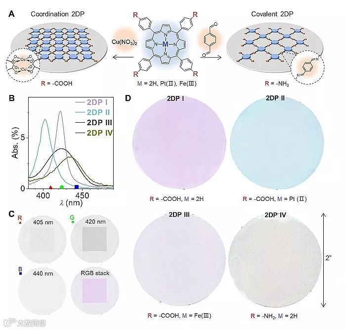 在此工作中,Jiwoong Park 教授课题组的研究人员合成了一系列基于不同卟啉环单体的二维高分子,包括了通过配位键连接的配位二维高分子(2DP I-III)和以共价键连接的共价二维高分子(2DP IV)。图2A展示了其相应的键连单元和结构示意图。四种二维高分子的性质直接由相应的卟啉环单体调控,实现了不同的光学吸收谱和骨架结构(图2)。通过LAP方法,研究人员可以合成面积达数十平方厘米的单层二维高分子薄膜,并转移到直径5厘米的石英衬底上(图2)。所合成的单层二维高分子薄膜在厘米级尺度上连续且高度均匀。