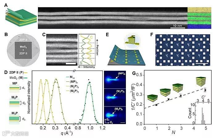 有了大面积制备连续单层二维高分子薄膜方法的加持,研究人员实现了由单层二维高分子和单层二硫化钼组成的有机/无机杂化范德华异质超晶格的构建。通过层层堆叠的方式,超晶格的结构和晶格常数可以被精准的调控。并且,组装得到的超晶格薄膜可以应用于电子器件阵列的制备(图5)。为二维高分子在电子器件中的应用和功能化电子器件的设计提供了一条新的思路。