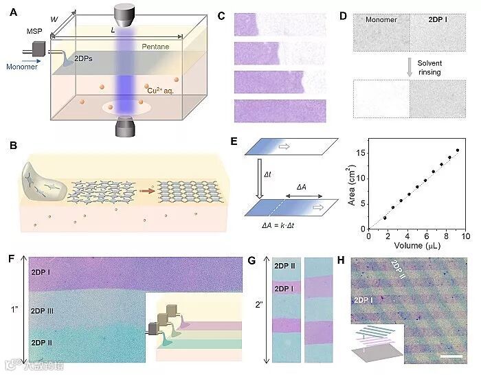 图1. 层流自组装聚合合成大面积、连续单层二维高分子薄膜。图片来源:Baorui Cheng / University of Chicago [1]