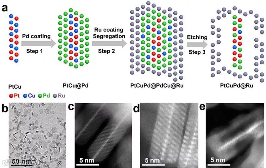 图1.(a)铂铜钯@钌yolk-cage纳米片的制备过程示意图。(b)铂铜纳米片的透射电镜图。(c)铂铜@钯核壳纳米片的透射电镜图。(d)铂铜钯@钯铜@钌核壳纳米片的透射电镜图。(e)铂铜钯@钌yolk-cage纳米片的透射电镜图。