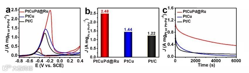 图2. 铂铜钯@钌yolk-cage纳米片、铂铜纳米片、商业铂碳催化剂在甲醇电氧化反应中的活性和稳定性比较。