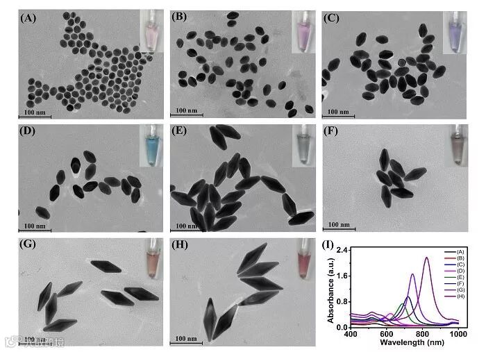 目视比色法是一种无需借助分析仪器,仅通过肉眼来判断待测物组分浓度的廉价检测方法。由于只能依据溶液颜色的深浅来估计待测物组分的浓度,传统的目测比色法在实际应用上具有一定局限性,特别是无法用于判断待检组分的浓度是否超过特定临界值。相比之下,多色比色法则可以实现裸眼半定量判断待检组分的浓度。纳米金锥(Gold nanobipyramids,AuNBPs)是一种具有构建多色比色法潜力的双锥型金纳米材料,通过调控AuNBPs的长径比就能使AuNBPs溶液能呈现出不同的颜色。目前,常见的调控AuNBPs长径比的方法是氧化刻蚀法。该方法通过产生与待测物组分的浓度成正比的氧化剂浓度,并用于氧化AuNBPs,从而根据不同待测物组分的浓度可得到不同长径比的AuNBPs氧化产物。但是,基于氧化刻蚀法的多色比色法普遍存在颜色数量少和颜色辨识度不高等问题。这是因为氧化刻蚀是一种剧烈的氧化反应,氧化过程中无法保证AuNBPs氧化产物的均匀度。这一不足限制了其在多色比色法中的进一步发展和实际应用。