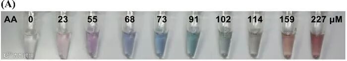 近日,福州大学的付凤富教授研究团队开发了一种基于还原型辅酶Ⅰ(reduced nicotinamide adenine dinucleotide Ⅰ,NADH)辅助抗坏血酸调控AuNBPs生长的多色比色法很好的弥补了上述不足。该团队发现抗坏血酸能够高效的调控AuNBPs的生长。在AuNBPs的生长过程中,抗坏血酸能够快速的将Au3+还原成Au+,然后在50℃下较缓慢地(15分钟)将Au+还原成金原子并定向沉积在金种上。随着抗坏血酸浓度的增加,所得到的金纳米颗粒从不规则球型逐渐向着米粒型、平头锥型和双锥型变化。由于该生长法得到的金纳米颗粒在形态上具有高度的均匀性,因此得到的AuNBPs溶液能够呈现清晰可辨的多种颜色。同时,该团队进一步发现NADH在AuNBPs生长条件下能够代替抗坏血酸将Au3+快速还原成Au+,却不具有将Au+还原成金原子的能力。因此,在NADH的辅助下可以大大减少抗坏血酸的用量,进一步提高调控AuNBPs生长的灵敏度。随着抗坏血酸浓度的增加,使用NADH辅助抗坏血酸调控AuNBPs生长法所得到AuNBPs溶液依次呈现出无色、红色、紫红色、紫色、蓝色、绿色、草绿色、墨绿色、红棕色和酒红色等十种色彩鲜明的颜色。该方法对抗坏血酸浓度的变化十分灵敏,能在一个数量级的浓度变化(23 μM-227 μM)中呈现九种颜色变化。上述现象说明借助NADH辅助抗坏血酸调控AuNBPs生长法可有望建立一种颜色丰富、高辨识度和高灵敏度的比色法。