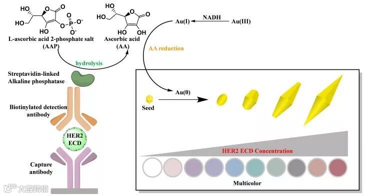 上述调控AuNBPs生长的方法可以用于构建高灵敏的多色比色检测方法。该团队进一步将所建立的AuNBPs生长法与传统的酶联免疫吸附法相结合,并选取了乳腺癌肿瘤标志物人表皮生长因子受体-2的胞外段(human epidermal growth factor receptor-2 extracellular domain,HER2 ECD)作为检测对象。首先,借助捕获抗体和检测抗体特异性结合HER2 ECD,形成夹心结构;然后,通过修饰在检测抗体上的碱性磷酸酶水解抗坏血酸磷酸酯得到抗坏血酸;最后,将抗坏血酸用于AuNBPs的生长,得到相应颜色的溶液。所构建的比色法成功地应用于血清样品(三倍稀释)中HER2 ECD浓度的检测,不但具有高灵敏度、高特异性和颜色丰富等特点,而且同样能在不到一个数量级的HER2 ECD浓度变化中(1.0-7.0 ng/mL)呈现九种颜色变化,有利于通过肉眼来有效判断HER2 ECD浓度是否超过其临界值(15 ng/mL)。值得注意的是,该多色比色法不仅仅局限于检测HER2 ECD,而是可适用于任何能够借助酶联免疫吸附法来检测的待测组分。