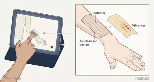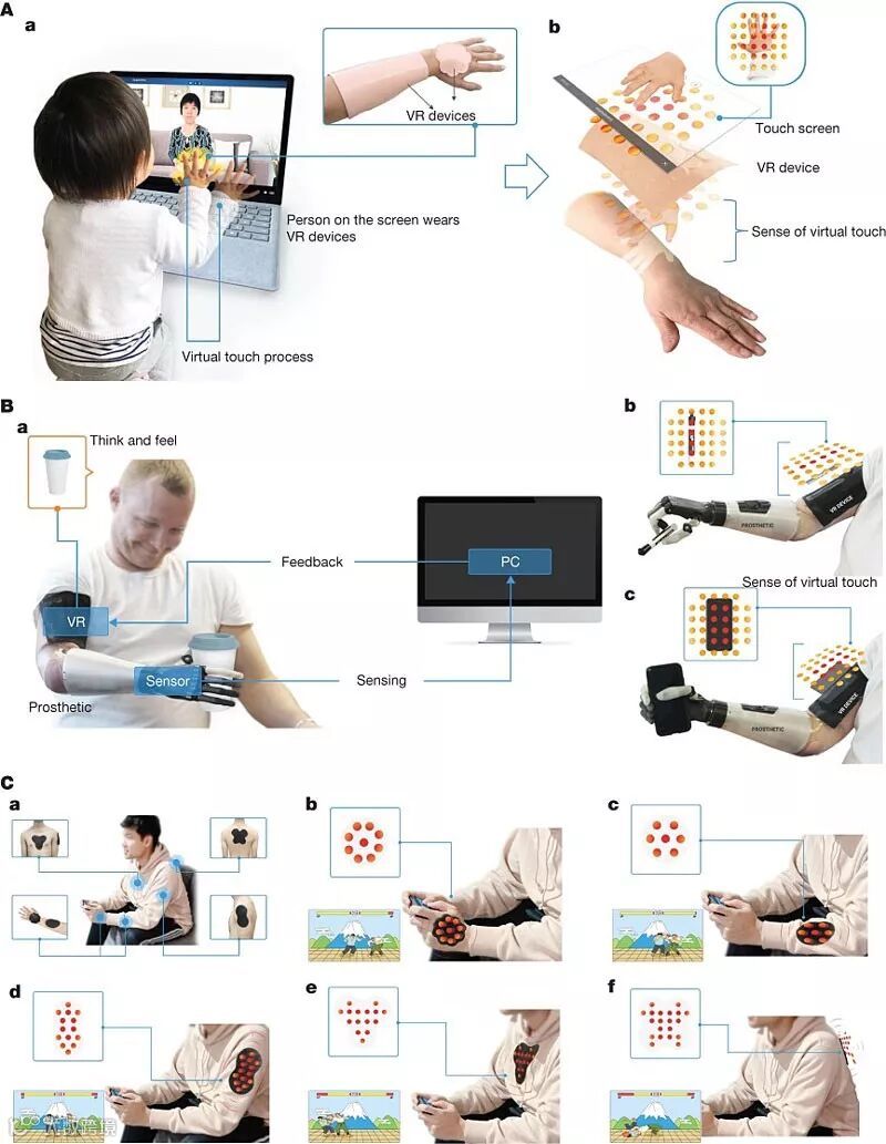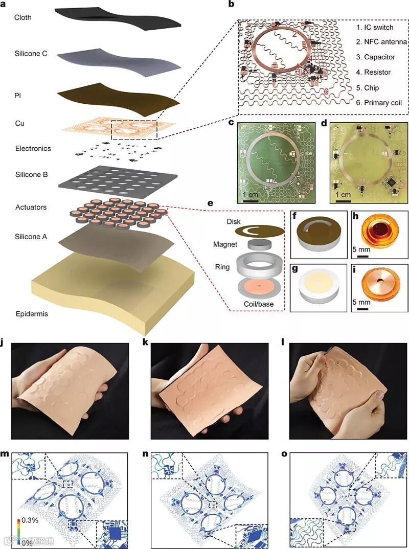 皮肤虚拟现实装置的总体结构和电路图。图片来源:Nature