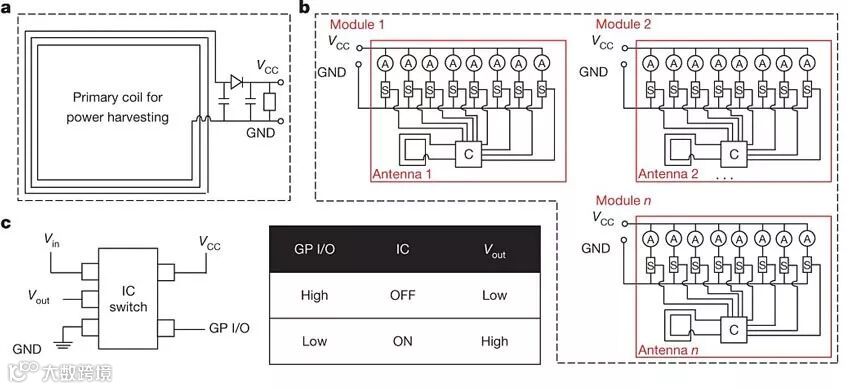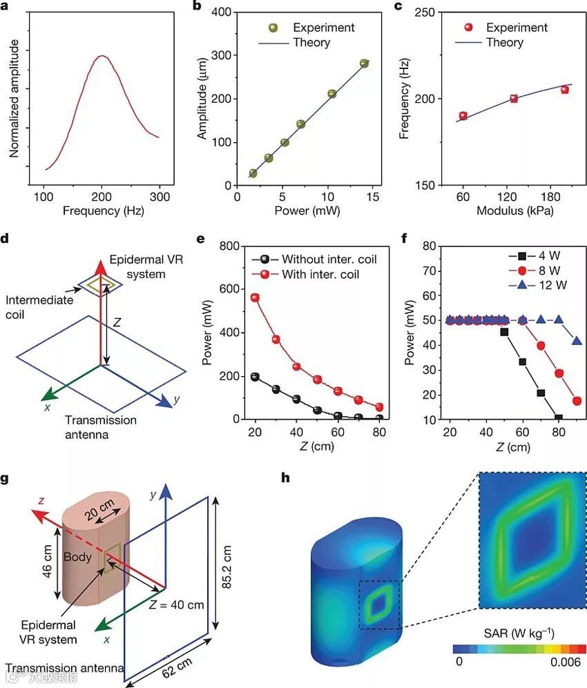 这些微型振动装置只需要大约1.75毫瓦,振幅约35 μm,就可以在指尖和手上引起显著的感觉。如此小的功率,通过电磁感应就可以满足供电需求,只要满足装置和无线电源的距离在1米以内即可。其通信方式采用近场通信(NFC),我们平日里坐地铁刷卡采用的就是这种无线协议。这就完美实现了无线、无电池的皮肤虚拟现实装置制备。