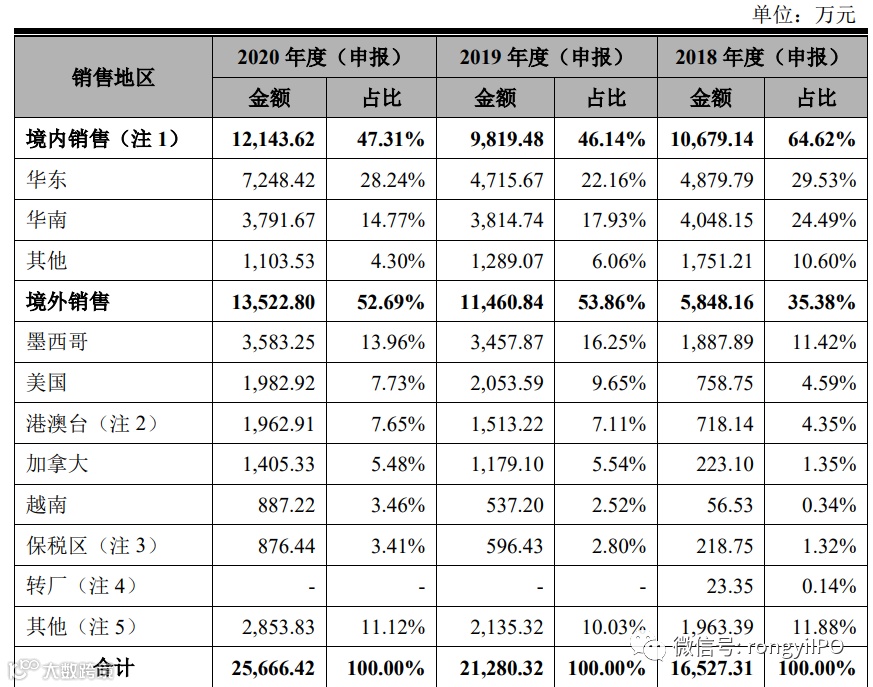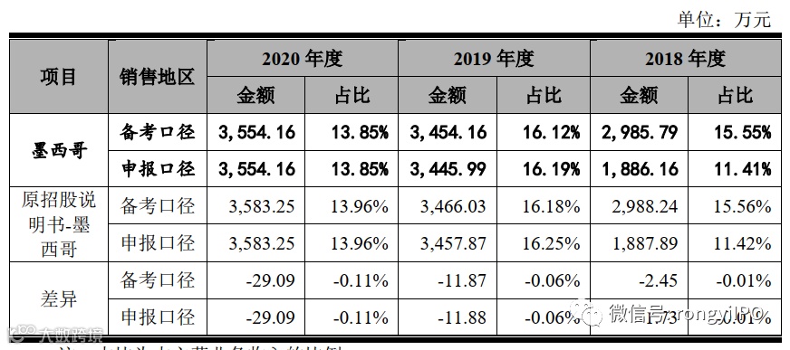 对此监管问询要求,提供报告期内墨西哥主要客户情况、销售内容、金额及占比,分析报告期内对墨西哥客户销售占比较高的原因。在回复中原因解释为收入贡献统计口径为货品销往地,销往墨西哥的产品主要通过美国客户,过程中存在小额统计错误。