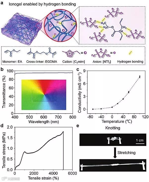 研究者使用丙烯酸乙酯单体和乙二醇二甲基丙烯酸酯交联剂制备了聚(丙烯酸乙酯)基弹性体,随后弹性体在室温离子液体[C2mim][NTf2]中溶胀得到离子凝胶(图1a)。之所以选择[C2mim][NTf2],是因为它与弹性体具有良好的混溶性,粘度低,室温离子电导率高,电化学稳定性良好。所制得的离子凝胶同时具有优秀的透明度、离子电导率和可拉伸性:厚度为0.34 mm的离子凝胶在400-800 nm的整个可见光范围内具有95%的平均透射率(图1b);随着温度升高,离子凝胶的离子电导率增加(图1c);离子凝胶能以10 mm min-1的速率拉伸至其原始长度的50倍而不会断裂(图1d)。卓越机械性能使得离子凝胶在打结之后,还能被大范围拉伸(图1e)。这种新型离子凝胶的性能,要远优于近期报道的其他韧性离子凝胶。