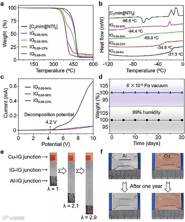 这种离子凝胶机械性能非常优秀,而且还可通过调整弹性体交联度以及离子液体含量来调整。随着弹性体内聚合物网络交联密度的增加,离子凝胶的拉伸断裂应变从490%显著降低到80%(图3a),而杨氏模量从15 kPa升高到484 kPa(图3b)。随着离子液体含量增加,离子凝胶的拉伸性、杨氏模量和韧性降低(图3c-d),离子液体含量越高,溶胀率越高,机械强度也就越弱。含有23 wt%离子液体的离子凝胶具有250 kPa的出色弹性模量,与生物组织的0.5-500 kPa具有可比性;且其断裂能为4.7 ± 0.3 kJ m-2,这创造了离子凝胶韧性的新纪录。这种离子凝胶也具有极好的稳定性:在N2气氛下,离子凝胶在高达约330 ℃的温度下可保持稳定(图4a);由于[C2mim][NTf2]的增塑作用,离子凝胶的玻璃化转变温度(Tg)随着[C2mim][NTf2]含量的增加而降低(图4b);在高达约4.2 V的电压下,离子凝胶也表现出良好的电化学稳定性(图4c);归因于[C2mim][NTf2]的不挥发性和疏水性,即使在6 × 10-4 Pa真空及99%相对湿度下储存30天后,这种离子凝胶的重量也几乎保持不变(图4d),表明离子凝胶适合在露天和潮湿环境中使用。此外,离子凝胶具有强且牢固的粘附力,不容易造成离子凝胶与电解质分层,发生机械变形时能确保其电性能的稳定(图4e及图5)。将离子凝胶-金属粘在一起,在空气中室温保存一年后,离子凝胶不仅可以保持其形状和透明度,而且对金属没有化学腐蚀作用(图4f)。良好的化学稳定性可保证基于离子凝胶的柔性电子设备可靠长期运行。