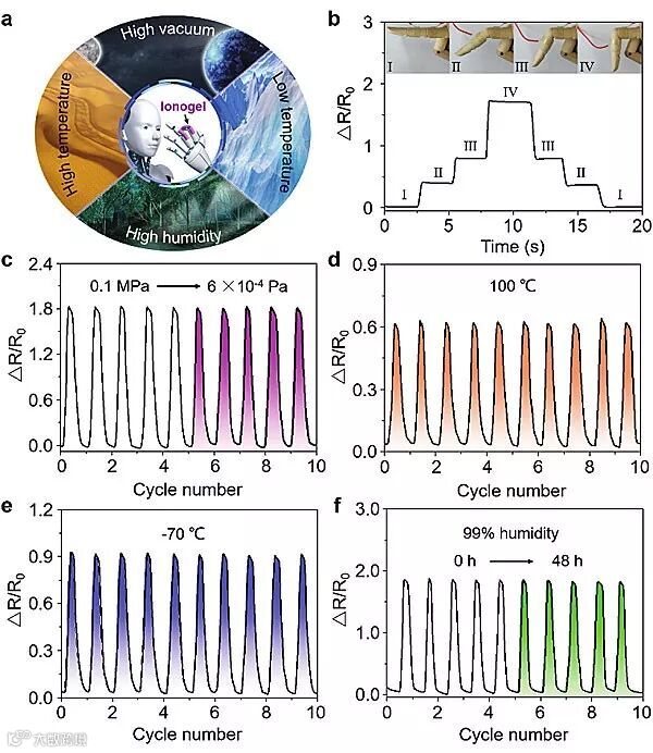 为了证明应用潜能,作者使用这种离子凝胶制作了高性能传感器。实验数据表明,这种传感器可以快速、精确地响应假人手指的动作(图6b),在各种极端环境下也能稳定的工作。例如,在高真空度(6 × 10-4 Pa)、高温(100 ℃)、低温(-70 ℃)、高湿度(相对湿度99%)下,均能稳定正常工作(图6c-f)。这些特性,使得基于离子凝胶的传感器可在许多特殊区域(如外太空、沙漠、南极和北极、雨林)中有着广阔的应用前景。
