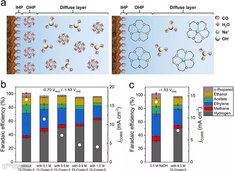 接着,研究人员进一步引入冠醚以螯合部分或全部Na+,冠醚的引入并不改变溶液pH以及阳离子电荷量,实验发现螯合的Na+导致C2+产物的生成速率急剧下降,借助原位红外光谱发现螯合的Na+由于其更大的尺寸使得外亥姆霍兹平面 (OHP)与电极表面的距离增大,以此证实了阳离子的性质和浓度对CO电化学还原的影响。