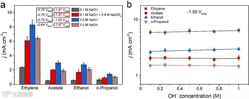 在最近的研究中,多伦多大学Edward Sargent课题组提出高浓度的碱性电解液可以提高C2+产物的生成速率 (Science, 2018, 360, 783-787),这是基于较高的OH-浓度促进了C-C的耦合的假设。在最新的关于CO电催化转化的研究中 (Nat. Catal., 2018, 1, 748-755) 也观察到了类似的现象。然而现阶段大量的实验和计算文章表明,C2+产物的生成经历Langmuir-Hinshelwood过程,决速步是涉及单电子转移的COads-COads耦联,其中并不包含质子的转移,所以理论上H+或OH-的浓度并不能影响C2+产物的生成速率。因此,OH-究竟对C2+产物生成有无影响以及高浓度碱性电解液为何可以提高转化速率等问题需亟待解决。