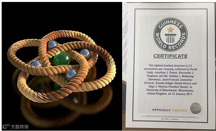 2017年,Leigh课题组报道了一种由新设计策略制备的由192个原子连续组成的八个交叉点的分子结(819结)(Science, 2017, 355, 159-162,点击阅读详细)。该策略以四个正八面体构型的亚铁离子为模板,四条配体形成环状螺旋体,然后通过闭环复分解(RCM)反应和碱性脱金属的反应,制备有机骨架的819分子结。该分子结由单晶衍射和核磁共振、高分辨质谱等手段进行了充分的结构验证。这种制备分子结的策略在编织更高维度的分子结的方面具有革命性的里程碑意义,不仅提供了构筑复杂结构的有效策略,也从化学的角度证实了在数学上发现的非交替结结构(即结点沿股线并不是通过上下交替的顺序)。该819分子结被美国化学会(ACS)评选为“2017年度分子”之一(one of the “Molecule of the Year 2017” by the ACS),并且,这个分子结也被吉尼斯世界纪录有限公司认定为世界上最紧的分子结,并获颁证书。