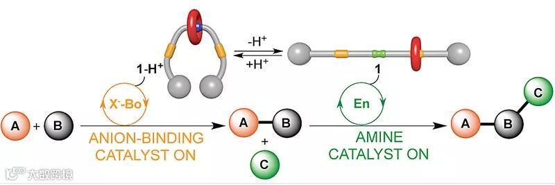 生物体中广泛存在利用分子机器来实现不同生命过程的现象,比如体内的变构调节酶。生物调节酶激发了科学家对人造催化体系的研究,其中,外加刺激可以用来显著改变化学反应的速率或立体选择性。近些年,氢键催化作为化学合成的有利工具被广泛研究。David Leigh 课题组描述了一种基于轮烷的可调控铵基催化剂,通过多种活化途径调节有机催化反应的速率,包括亚胺离子、烯胺和三胺,甚至串联亚胺烯胺过程(J. Am. Chem. Soc., 2014, 136, 15775-15780)。进一步,他们又提出了一种新的由上述轮烷的三唑鎓基团作为阴离子结合催化剂,能够原位生成离子中间体。因此,在该体系中存在两种催化模式,即铵基催化剂(1-H+)和阴离子结合催化剂。这两种不同的催化模式原则上可以按顺序激活,使轮烷分子开关可以依次促进阴离子结合/铵基催化的过程(J. Am. Chem. Soc., 2017, 139, 9376-9381)。