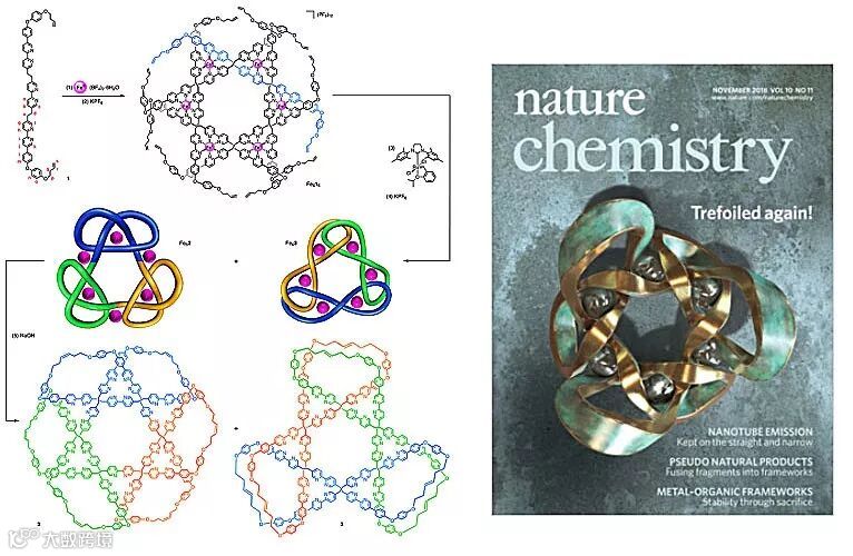 2018年,Leigh课题组报道了迄今为止最复杂的复合分子结的立体选择性合成和表征(Nat. Chem., 2018, 10, 1083-1088,点击阅读详细)。利用合成819分子结类似的策略,六条配体以六个亚铁离子为模板,形成了环状螺旋体,然后通过RCM反应成环,形成两种拓扑异构体。通过结晶的方法,成功的分离到了纽数达9的复合结。在这个工作中,作者通过精准的控制配体末端烯基的RCM连接方式,高效立体选择性合成含有九个交叉点的最复杂的复合分子结。这个研究对于分子拓扑学在未来能源和材料方面的研究巨大的促进作用。由于其重要性,这个工作作为封面发表于Nature Chemistry 杂志,而且被美国化学会(ACS)评选为“2018年度分子”之一(one of the “Molecule of the Year 2018” by the ACS )。该工作的第一作者张亮博士也于2020年加入华东师范大学化学开展以单分子拓扑结构为基础的新型编织材料的合成等相关工作。