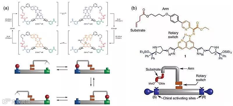 Leigh课题组还一直致力于通过模拟生物体中转运蛋白(Kinesin等)的工作原理,设计与合成具有选择性运送目标分子的“机械臂”(图2a)。通过组合几种分子机器功能,便可实现分子机械臂对于目标分子的搭载、转运和卸载等可序化的系列操作。其中,目标分子的搭载和卸载分别通过二硫键的生成和断裂实现,而“放置”目标分子的过程则得益于腙键的形成(Nat. Chem., 2016, 8, 138-143)。2017年,Leigh与合作者通过改良分子机械臂的设计,将原有的底物释放位点改为具有不同手型的催化活性位点,实现了“一锅法”合成四种非对应异构体(图2b)(Nature, 2017, 549, 374-378,点击阅读详细)。该分子机械臂式是首例基于程序化调控从而实现不同功能的分子机器,该研究工作为未来“分子机器人”的发展奠定了坚实的基础。