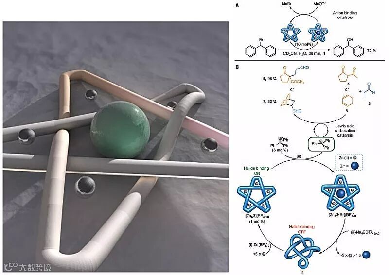 除了构筑新型的分子结,Leigh课题组还进一步探索分子结的应用。2016年,Leigh课题组报道了人工合成“五叶结”分子模拟生物异构酶的催化性质。该研究表明这种分子结可以有效降低底物弹性链的自由度,从而制备用其他方法不能制备的构象分子(Science, 2016, 352, 1555-1559,点击阅读详细)。该工作的一个亮点在于作为分子结模板的亚铁离子可以被置换成锌离子,而含有锌离子的五叶结分子具有帮助断裂溴代联苯甲烷中的C-Br键形成碳正离子的催化作用。他们同时发现,形成的碳正离子可以作为路易斯酸促进迈克尔加成反应。这种分子内变构调控另一处位点催化活性的机制,与一些酶的作用机制非常类似。从而这项研究对探索DNA和蛋白质内分子结的形成以及功能具有开拓性的意义。这项研究被C&EN 作为亮点报道,并且被MIT的Swager教授在Synfacts专刊报道(Synfacts, 2016, 12, 911)。