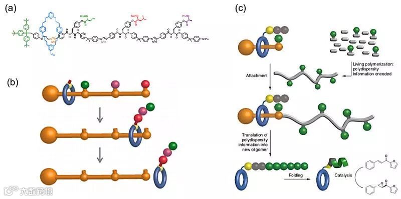 Leigh课题组报道合成了首例可以构筑特定序列三肽的人工小分子机器(图1a-b)。该合成子在概念上模拟了核糖体合成蛋白质的过程,通过控制氨基酸的引入位点,大环分子臂上的硫醇基团可依次与轴上的氨基酸片段反应,并被转移到大环分子臂上,最终合成具有特定序列的三肽(Science, 2013, 339, 189-193)。在此基础上,在轴上引入接枝了亮氨酸的聚苯乙烯片段,分子机械臂可以依次与这些底物片段发生反应生成有机低聚物,最终折叠成具有手性的螺旋结构(图1c),通过该方法构筑的螺旋结构可以用于不对称催化Julia-Colonna 环氧化反应(Nat. Nanotechnol., 2018, 13, 381-385,点击阅读详细)。这些研究结果证明了分子机器不仅可以准确控制肽段的合成,还可以复制和保留聚合物的长度信息。