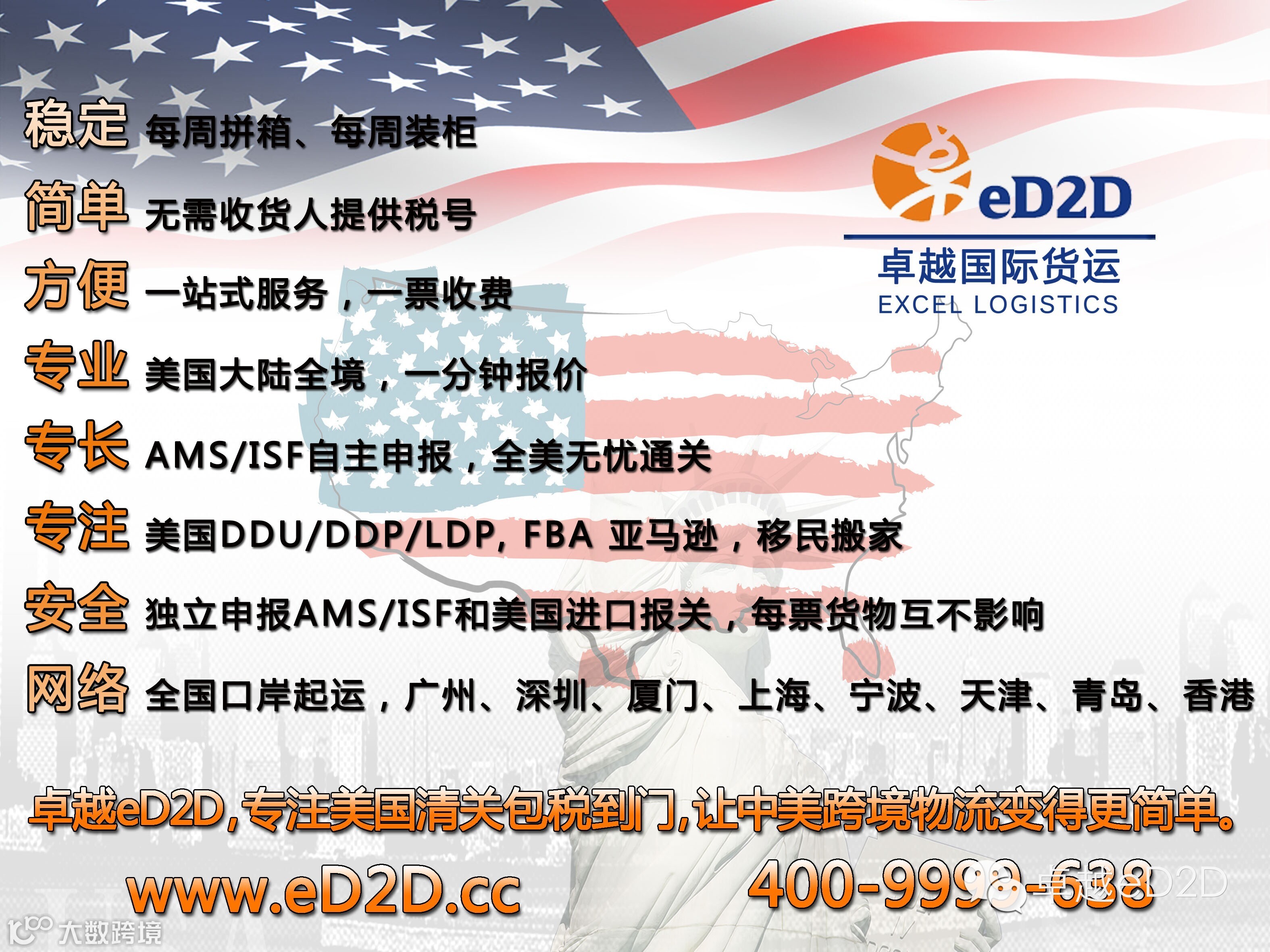 卓越eD2D主营美国清关包税到门,只需托运人把货交到指定仓库,收/发货人无论是个人还是公司,无论是否具有进出口资质,只需提供箱单发票,一站式服务一口价一票收费,安排清关后直接按托运人指示预约送货到门,适用于DDU、DDP、LDP、EXW等各种国际贸易交易条款。