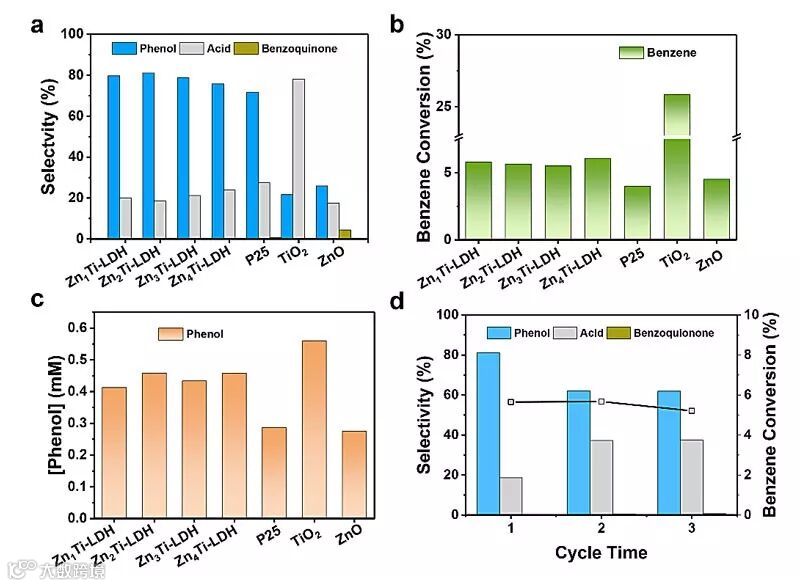 如图5a所示,传统的光催化剂P25、TiO2(锐钛矿)和ZnO催化剂用于该反应时,苯酚的选择性分别为~71.76%、21.66%和为25.90%。而不同Zn/Ti比例的ZnTi-LDH (记为ZnxTi-LDHs (x = 1,2,3,4))均显示出对苯酚的高选择性,其中Zn2Ti-LDH的苯酚选择性最高,在3 h内达到了81.12%的苯酚选择性和5.7%的苯转化率。