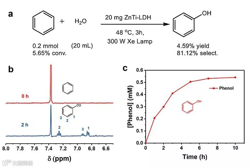 图4. (a) 苯选择性氧化为苯酚的反应式; (b) 反应前后的1H NMR图:苯 (20 mM) 和D2O (5 mL), 48°C; (c) 随反应时间变化的苯酚生成量变化曲线。