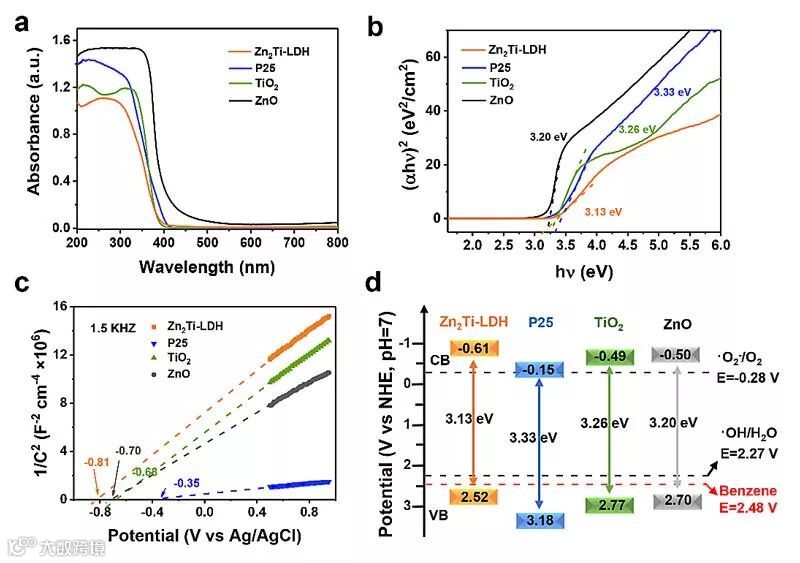 图2. (a) 紫外线可见的漫反射光谱; (b)对应的(αhν)2图; (c) Zn2Ti-LDH, P25, TiO2 (锐钛矿)和ZnO的莫特-肖特基图; (d) 价导带分布图