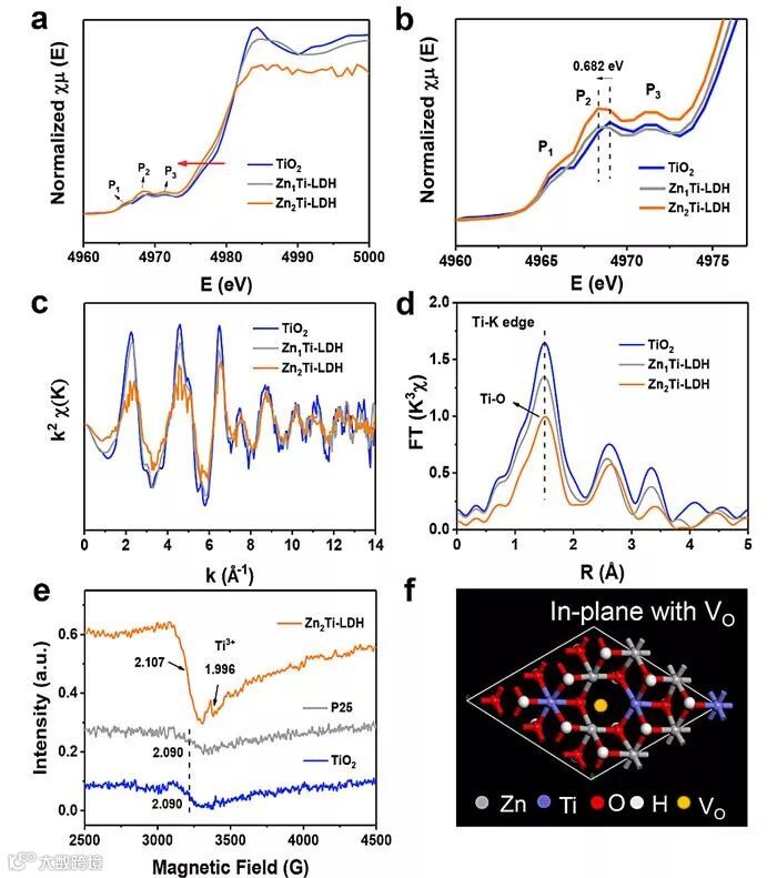 图3. (a-d) Zn1Ti-LDH,Zn2Ti-LDH和TiO2中Ti的K边X射线吸收精细结构分析;(e) Zn2Ti-LDH,P25和TiO2 的ESR光谱图;(f) 掺杂Vo空位的Zn2Ti-LDH的晶胞模型的平面示意图。