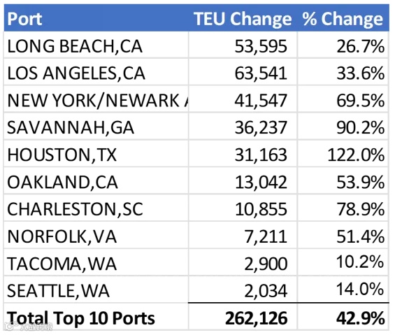 特别值得一提的是,虽然洛杉矶港环比增长33.6%和长滩环比增长26.7%等美西港口继续显示出强劲的复苏,事实上,美东和美湾港口的增长更为显著。休斯顿从中国进口集装箱量环比增长122.0%,或增加31163TEU领先所有港口,其次是萨凡纳环比增长了90.2%、纽约/新泽西环比增长69.5%和查尔斯顿环比增长78.9%。即使是塔科马(10.2%)和西雅图(14.0%)等通常吞吐量较低的美西港口也出现了增长。
