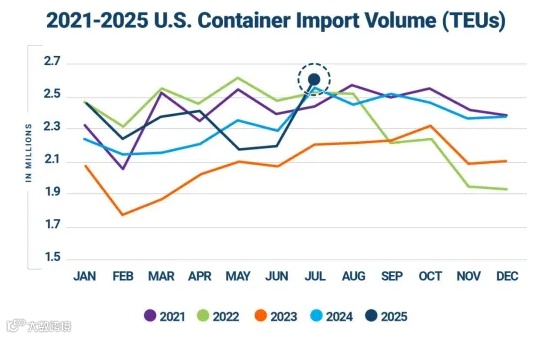 2025年7月,美国前10大港口从中国进口集装箱环比增长42.9%,净增长26.2万TEU。