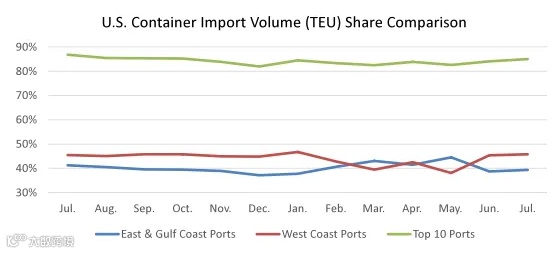 总体而言,美国前10大港口7月份集装箱进口量占总量的85.1%,比6月份的84.1%略有上升。