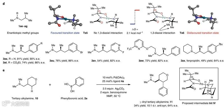 既然手性氨基酸配体在该反应中扮演着关键角色,那能否实现手性诱导呢,比如通过过渡态区别N-异丙基上两个完全相同的甲基实现去对称化呢?带着这些问题,作者进行了计算研究。他们认为C(sp3)–H键存在一种椅式过渡态,参与C-H键活化的甲基应与配体上乙酰基的O接近,而未反应的甲基处于平伏键时能量相对更低(TS5),否则会与N-Me产生1,3-直立键相互作用(TS6),但无论哪种情况异丙基上两个甲基都可以被配体区别开。实验证实含有异丁基的烷基叔胺与一系列的芳基硼酸在Pd(OAc)2/4a催化下能以较好的ee 值得到γ-C(sp3)–H芳基化产物(3as-3ax)。另外,环状二甲氨基衍生物10上的亚甲基C-H键也能实现γ-C(sp3)–H芳基化。