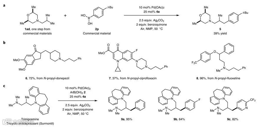 上文已经提到很多药物中都含有烷基叔胺结构,于是作者便用该策略对几种药物进行合成或修饰。例如,可以将中间体1ad和硼酸2p一步制备农药丁苯吗啉5(下图a);对乙酰胆碱酯酶抑制剂多奈哌齐、抗生素环丙沙星及抗抑郁药氟西汀和丙咪嗪都可以进行γ-C(sp3)–H芳基化修饰(6-9),这些结果证实了其在药物后期功能化中的应用潜力。