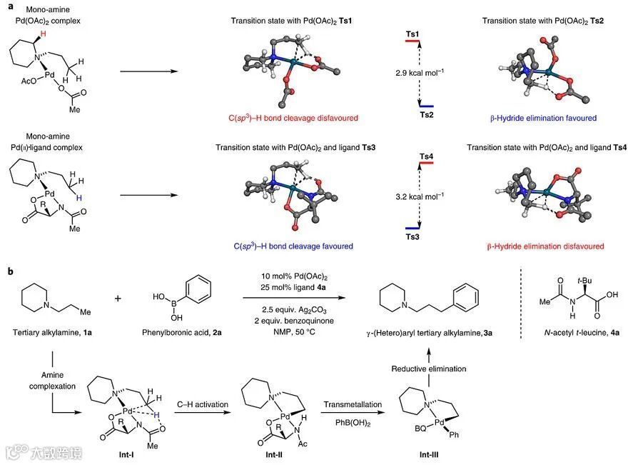 如上所述,实现烷基叔胺γ-C(sp3)–H芳基化的前提是要通过叔胺的配位作用形成五元环钯中间体。尽管,早在1985年Ryabov等人就认为N,N-二甲基苄胺可以与Pd(II)形成五元环钯中间体(J. Chem. Soc. Dalton Trans., 1985, 12, 2629–2638),但推广到烷基叔胺上,发现这种环钯中间体被过多的C-H键包围,很可能发生不利的β-H消除反应。因此,起初作者用烷基叔胺1a和苯硼酸2a在醋酸钯催化下进行反应,并未得到芳基化产物,而是叔胺分解的产物。这也与计算结果一致:醋酸根协助的β-H消除过渡态Ts2的能量要比C(sp3)–H键活化过渡态Ts1低(下图a)。是否可以引入配体来翻转这两种过渡态的能量呢?2014年,余金权课题组发现在N-乙酰基-α-氨基酸的作用下,N-烷基磺酰胺可与芳基硼酸酯实现C(sp3)–H芳基化,而没有该配体时反应则不能发生(Nat. Chem., 2014, 6, 146–150)。这就提示,N-乙酰基-α-氨基酸能促进C(sp3)–H键活化。作者通过计算发现,在N-乙酰基叔丁基-亮氨酸4a的存在下,β-H消除的过渡态TS4的共平面性被打破,而碱协助的C(sp3)–H键活化过渡态TS3相对更有利,再经过C(sp3)–H键活化中间体Int-I转化为环钯中间体Int-II后,通过转金属化转化为Int-III,最后还原消除实现γ-C(sp3)–H芳基化。实验结果也证实这点:在Pd(OAc)2/4a催化体系下,1a可以顺利地转化为γ-C(sp3)–H芳基化产物3a(产率:81%)。